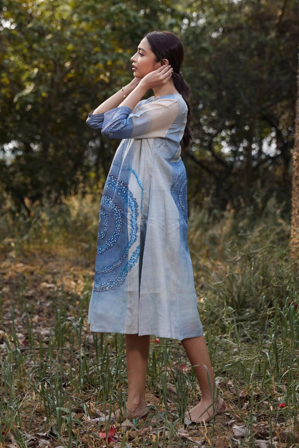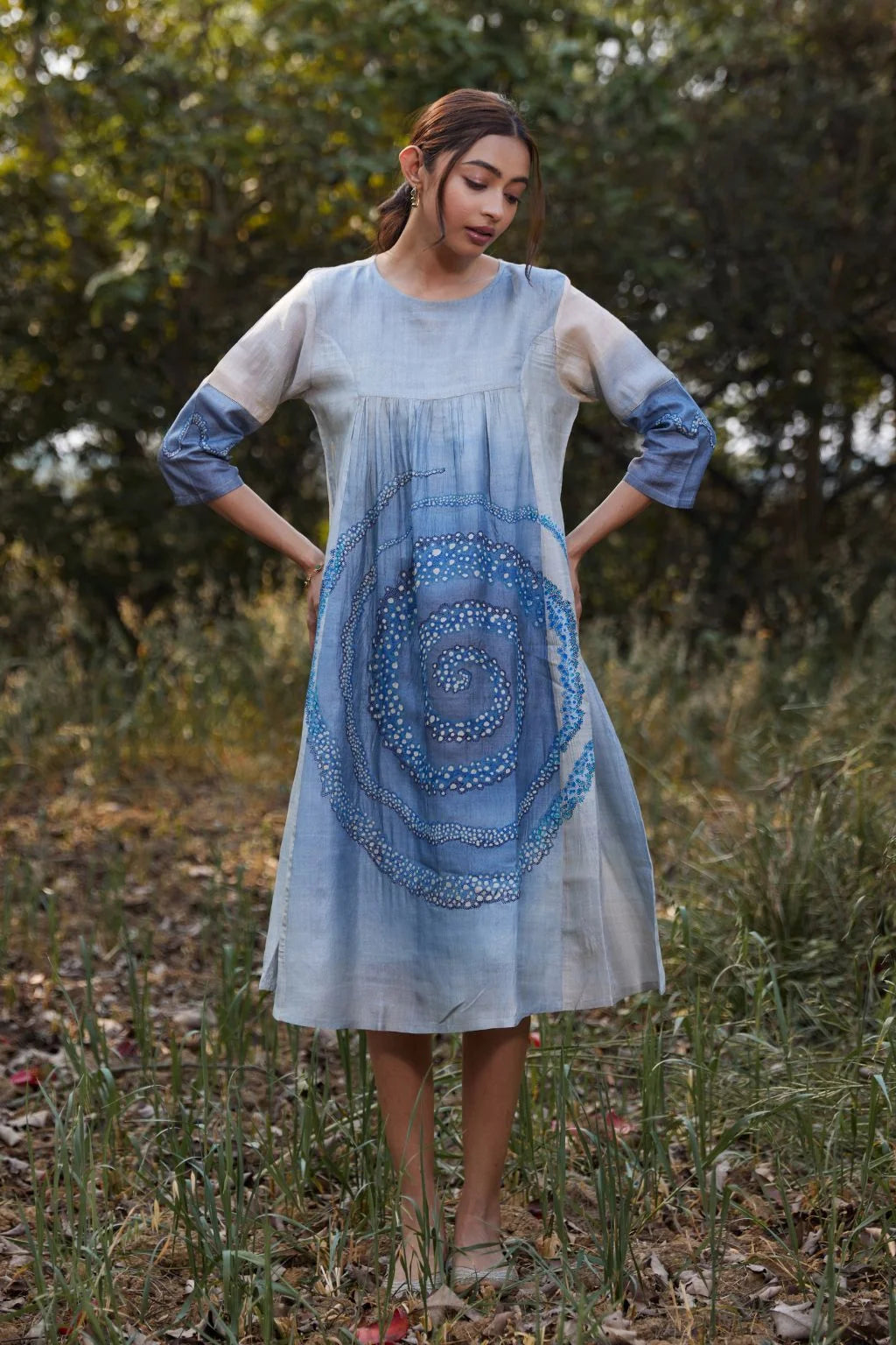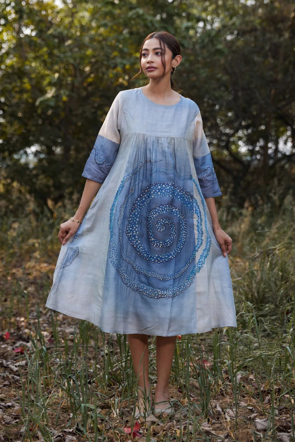 Embrace elegance with the Arpita Dress, crafted in a serene light blue shade. This full-length dress features a flattering round neckline and intricate pleated details that add texture and movement. The 3/4th sleeves and precise needlework ensure a polished look, while the soft material provides comfort. Highlighting the front side is a mesmerizing spiral printed design, making this dress a perfect choice for both casual outings and special occasions.